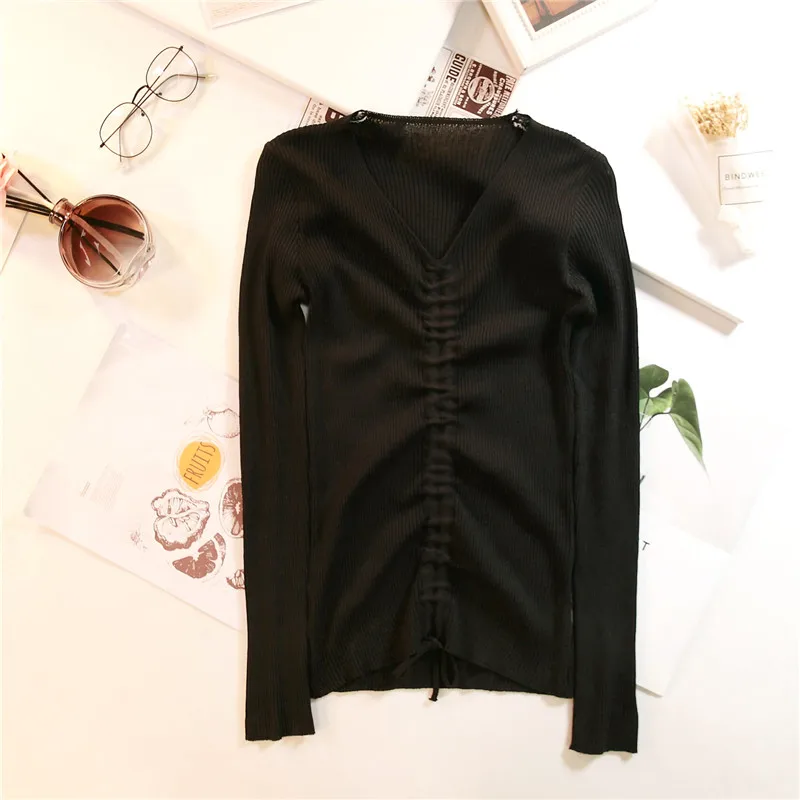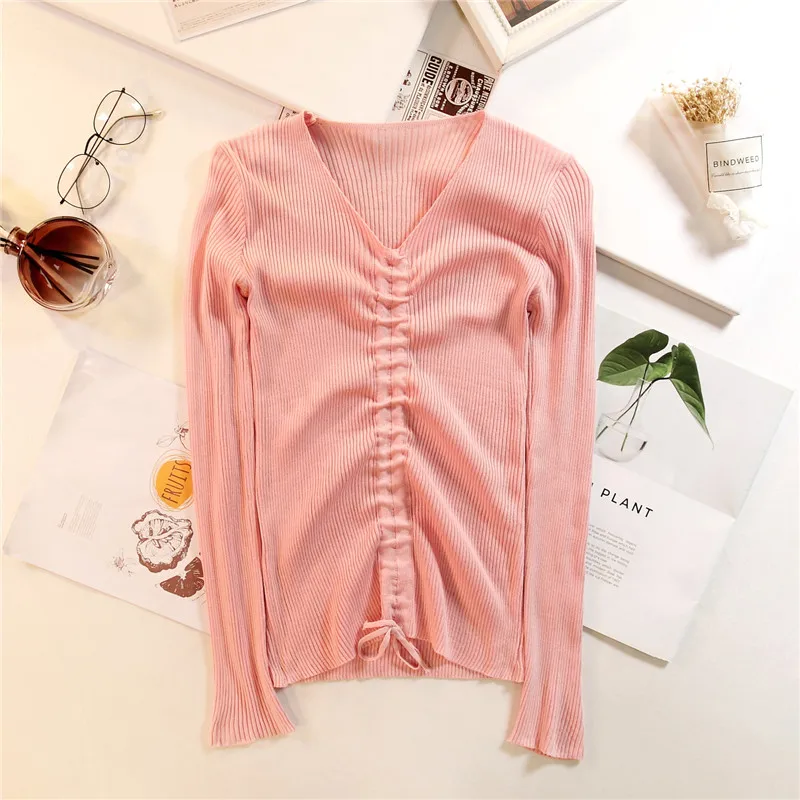Buy New Women Knitted V-neck Full Sleeve Draw String Sweaters Pullovers Female Knitting Soft Sweater To