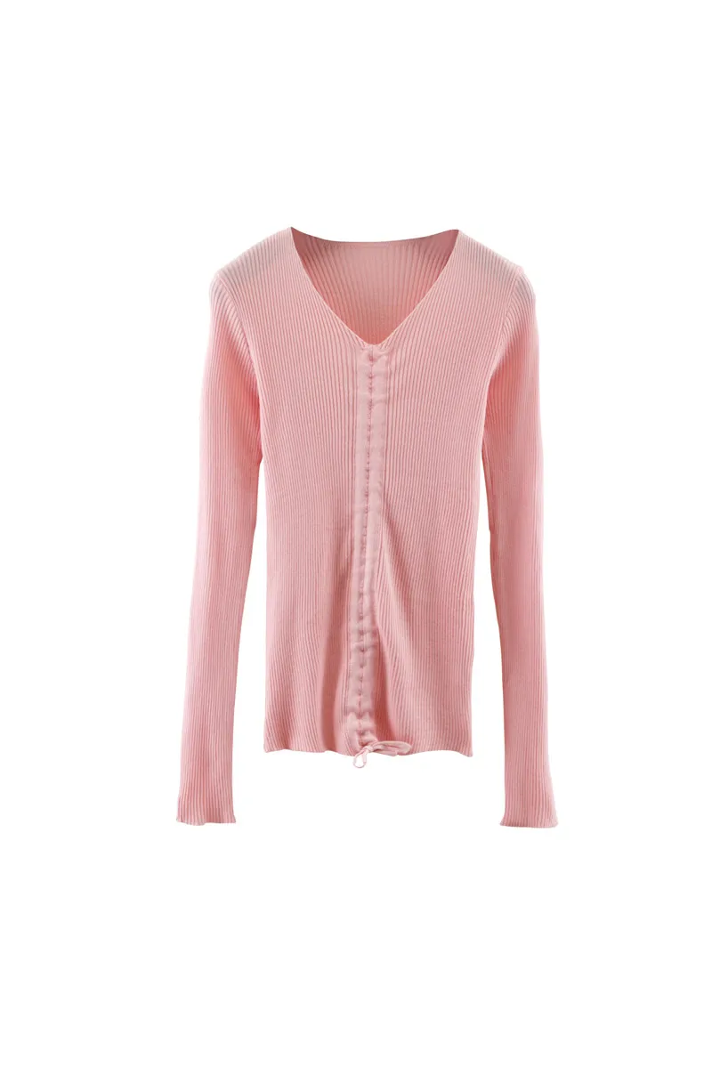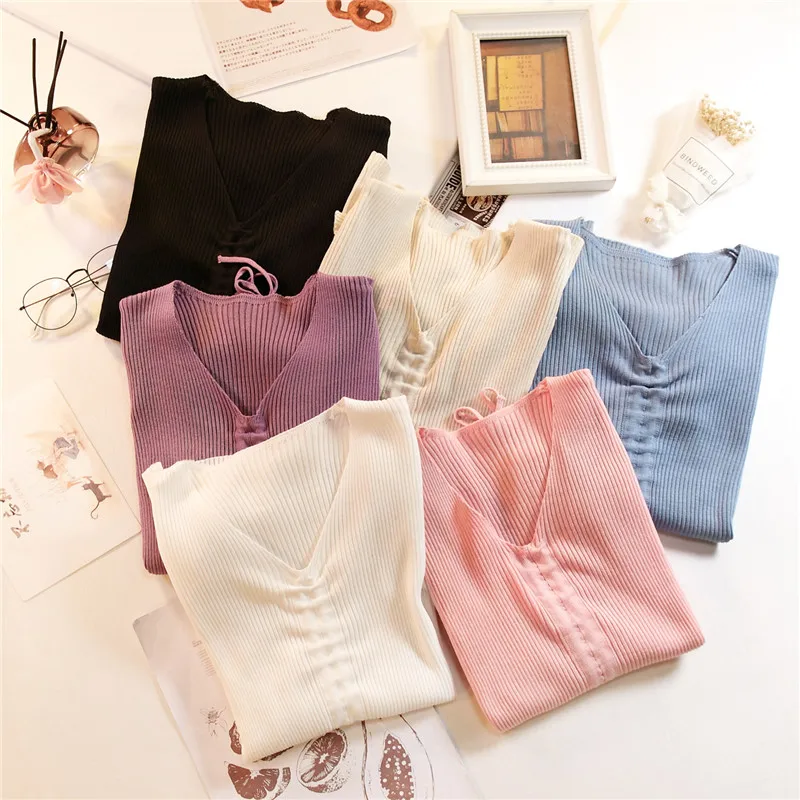 Best New Women Knitted V-neck Full Sleeve Draw String Sweaters Pullovers Female Knitting Soft Sweater To
