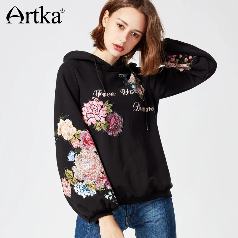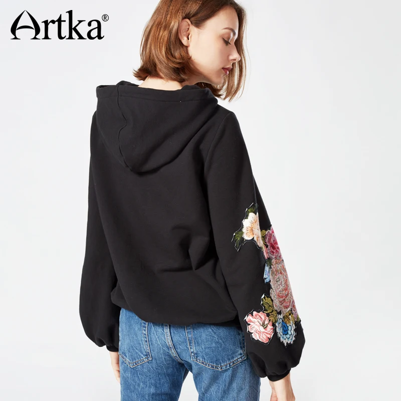Best ARTKA 2018 Autumn &Winter Lantern Sleeve Vintage Flower Embroidery Pullover Hoodie with Hat VA10271