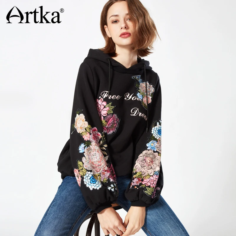 Buy ARTKA 2018 Autumn &Winter Lantern Sleeve Vintage Flower Embroidery Pullover Hoodie with Hat VA10271