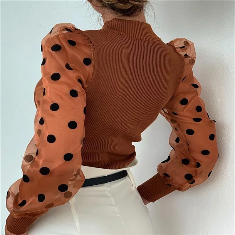 New Women Elegant Knitted Blouses Mesh Puff Polka Dot Long Sleeve Shirts Ladies Turtleneck Tops Spring