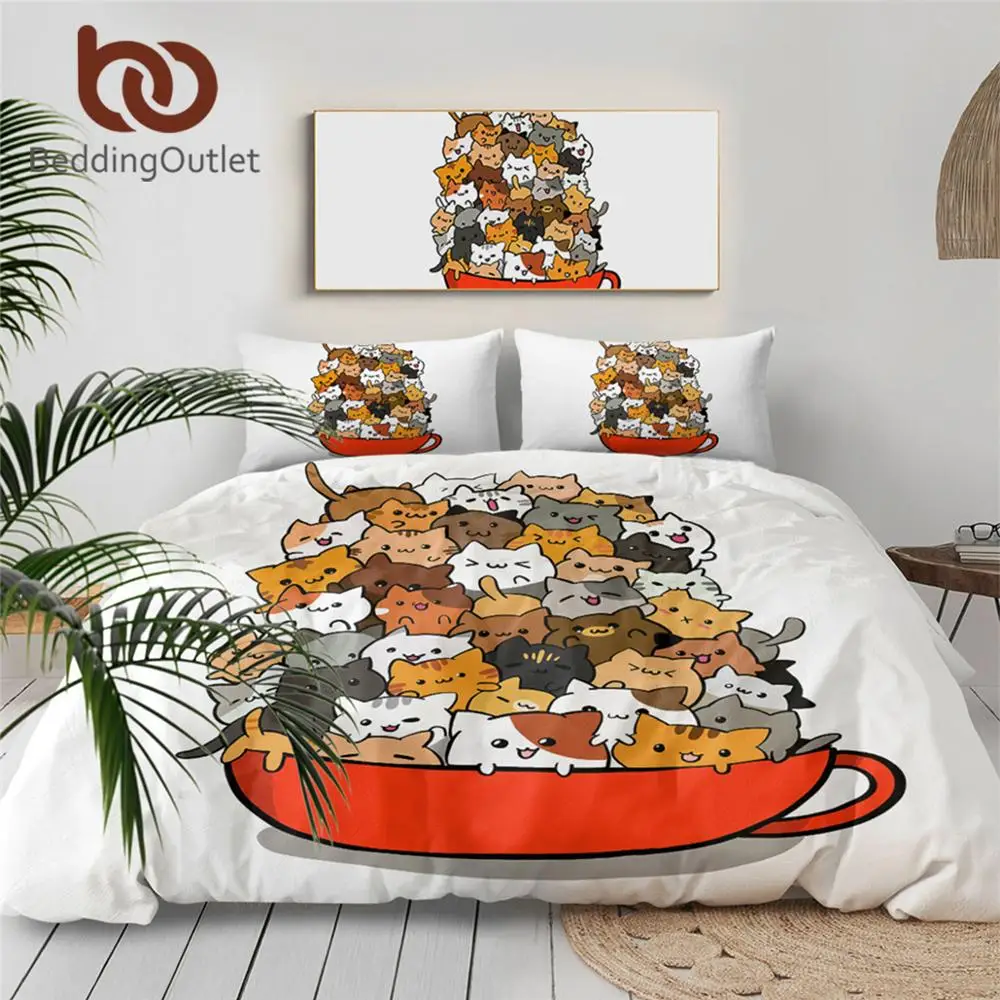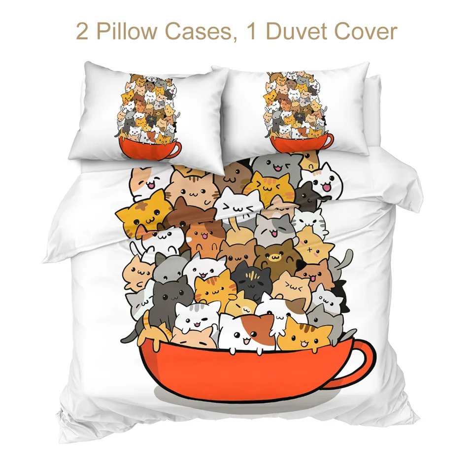 New BeddingOutlet Teacup Cat Bedding Set Comforter Cover Cute Bed Set King Cartoon Kids Bedspreads 3pcs